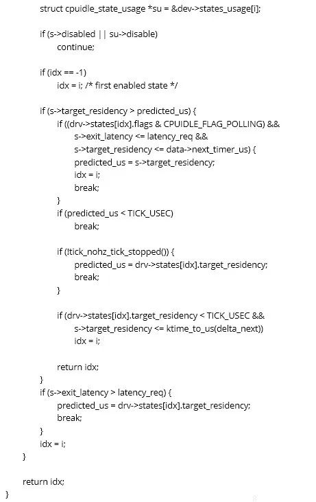 最后根据前面计算出来的两个因素来选取具体的idle state,将计算出的predicted_us与所有idle状态的停留时间进行比较,选择特定idle状态的条件是相应的停留时间应小于predicted_us。另外,将状态的exit_latency与系统的交互性要求进行比较。基于两个等待时间因素,选择适当的空闲状态。