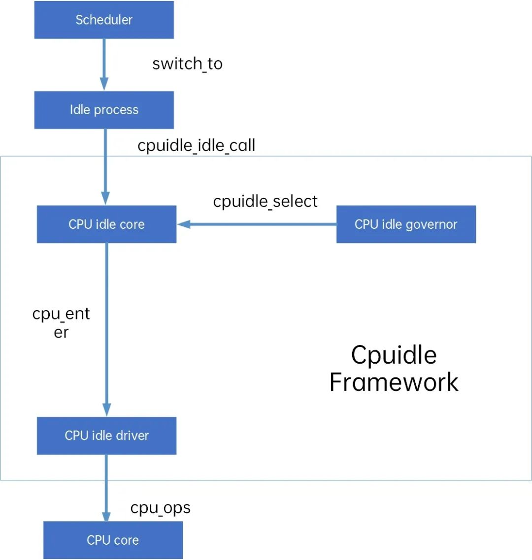 CPU调度器发现没有任务在运行时,会切换到idle进程,通过cpuidle_idle_call接口调到cpuidle framework中,cpuidle framework内部会选择适当的策略在决定进入哪种状态,然后回调到driver端实现。