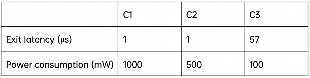 C state根据不同的深度会存在不同的退出延迟和功耗,如下图所示