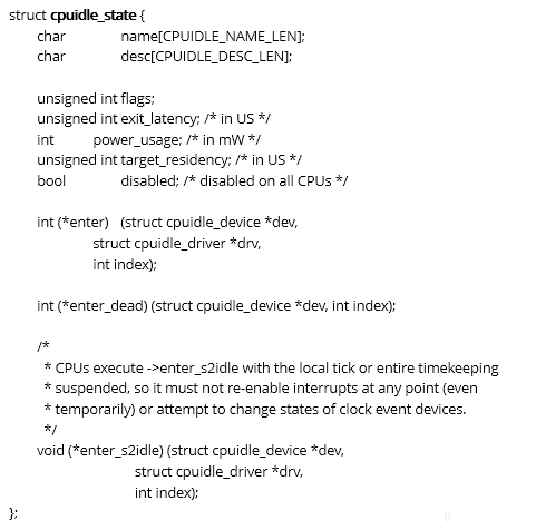 当CPU进入idle状态后,CPU将停止时钟并且部分硬件将会停止使用,以此来减少CPU所消耗的能量。但是在这种情况下,该CPU的性能会受到很大限制。控制好CPU如何进入/退出CPU idle深度(即C state)是CPU idle子系统中一个关键点。