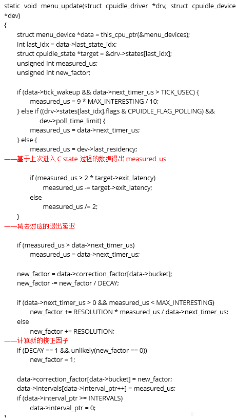 在cpu退出idle状态后,menu governor会将将上一轮的进入idle状态的数据更新到menu driver中,作为下一次select的参数。