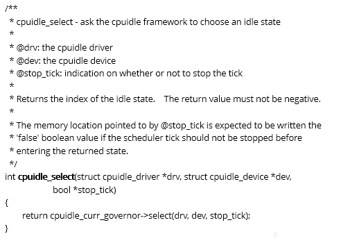 进入cpuidle流程后,会根据系统中对应governor策略进而选择不同的idle state。