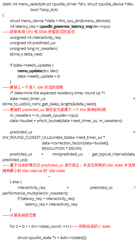 而以上两个因素,menu governor的职责具体到实际情况中,便转换为了两个任务:1.预测C state的停留时间。2.计算系统延迟容忍度