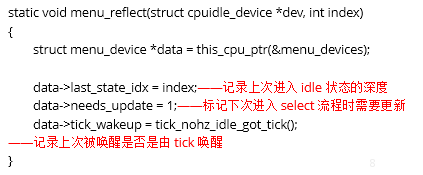 系统在选择完idle state后,还会调用cpuidle_reflect()将选取过程中一些信息和结果保留下来,以备下一次选取使用。