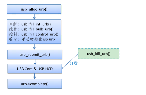 Usb3.0相比于usb2.0,在usb core层,驱动并没有太大变化,仍旧与原来的流程相同,usb代码的核心数据结构仍然是URB,URB的使用方法也与原来相同: