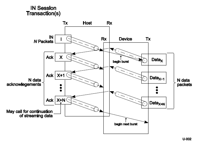 主机和设备应遵守传输类型和端点特性的限制。主机通过发送一个确认包(IN)到设备发起一次传输。这个确认包包含了将包路由到预想的端点的寻址信息。主机告诉设备它可以发送的数据包的数量,以及预计从设备接收到的第一个数据包的序列号。作为回应,端点会以适当的序列号发送数据包回主机。确认包还暗含地确认,以前的数据包被成功收到。
