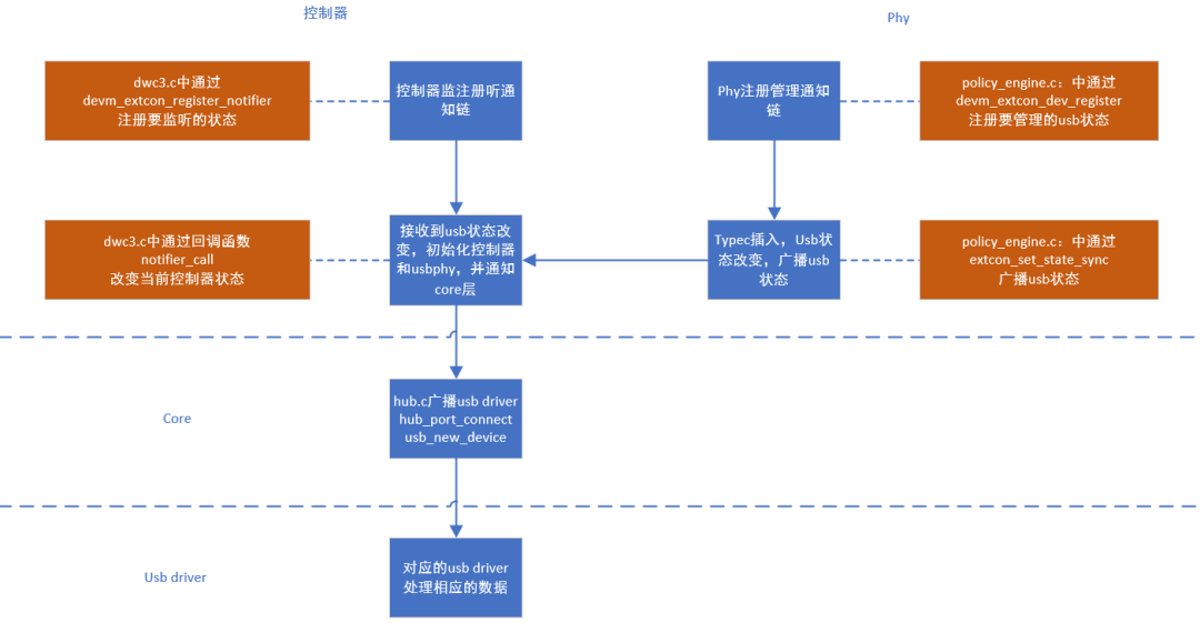 External Connectors是usb用于状态通知的驱动,当phy收到中断,处理完usb状态后,通过extcon驱动,广播到已监听该extcon的所有驱动