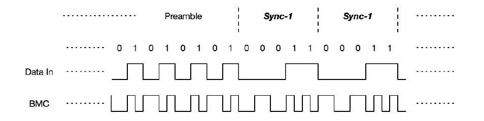pd3.0开始使用Biphase Mark Coding (BMC)编码格式,这种编码的特点就是,每一个bit周期开始时电平会切换一次,在这个周期内电平如果不切换则表示bit0,如果电平切换了一次,则代表bit1