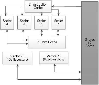 Hexagon处理器中包含常见的处理单元XU(Execution Unit)、$(Cache)、RF(Register File)、MMU(Memory Management Unit)等。每个硬件线程均包含32个向量寄存器,4个predicate寄存器。每个向量寄存器宽度为1024bit,可以以word、halfword或byte三种方式进行运算。每个predicate寄存器包含128bit。两个向量寄存器(vector)可以组成一个寄存器组(vectorPair)。