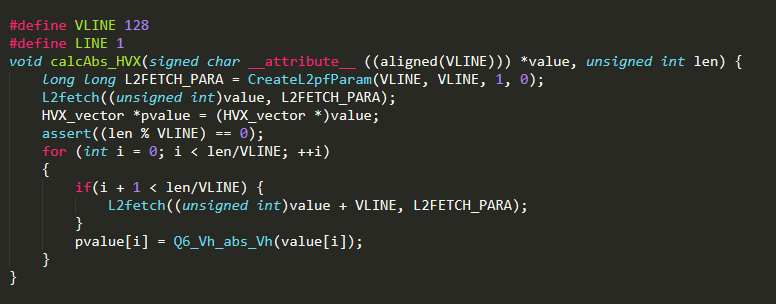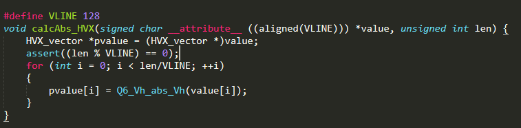 通过上面的对比可以看出,HVX 并行处理可以大大减少循环次数,只有原来的128分之一,显著提高运算效率。其中的Q6_Vh_abs_Vh()这个函数是HVX封装的intrinsic 接口。可以通过查询HVX programming guide 文档选择合适的指令。