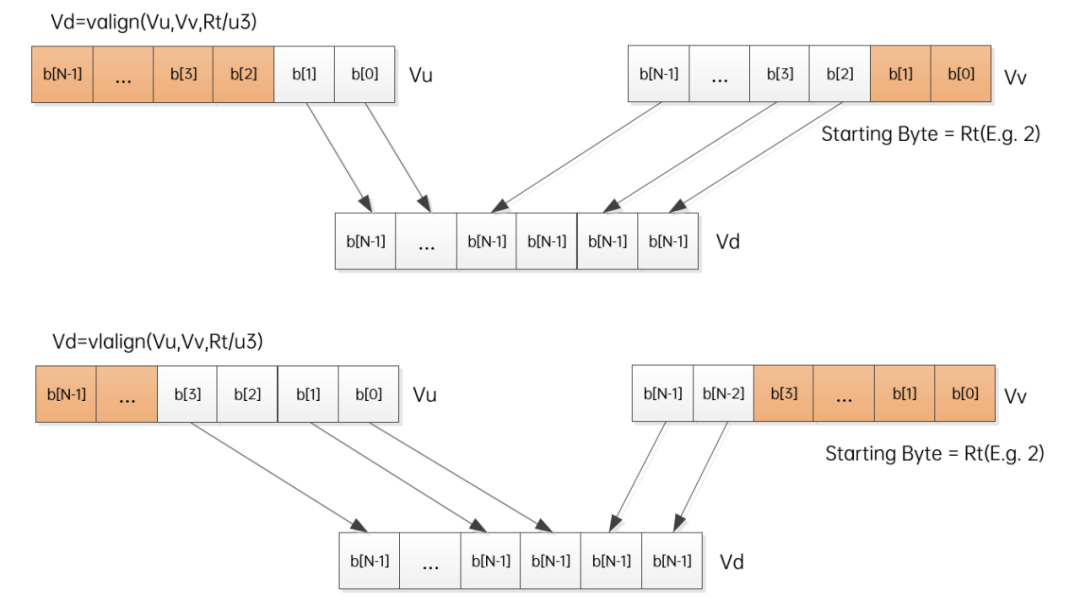 valign/vlalign:去掉右边/左边寄存器的Rt个字节,将剩下的拼接在一起