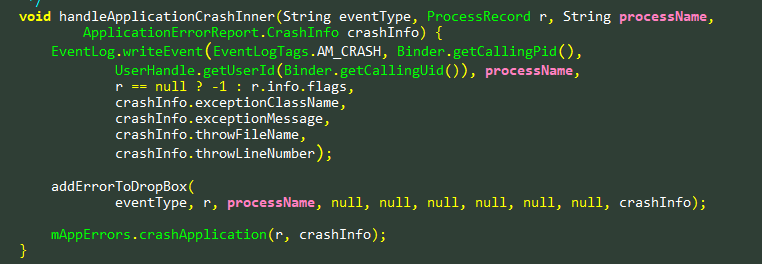 有了crashInfo,又拿到了processRecord信息和进程名,接下来继续执行crashInner处理方法。HandleApplicationCrashInner主要完成两件事情,一是调用addErrorToDropBox,将crashInfo的关键信息输出到dropbox文件中,目录位于data/system/dropbox,根据异常的进程名,一般名为system_server_crash@***.txt,system_app_crash***,data_app_crash***。