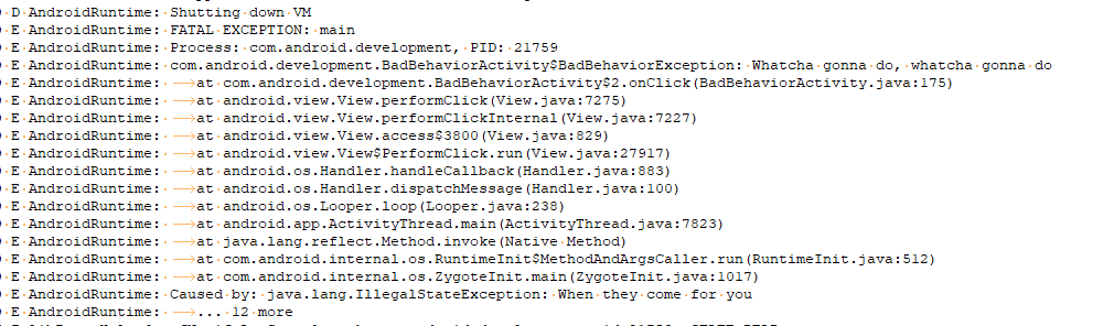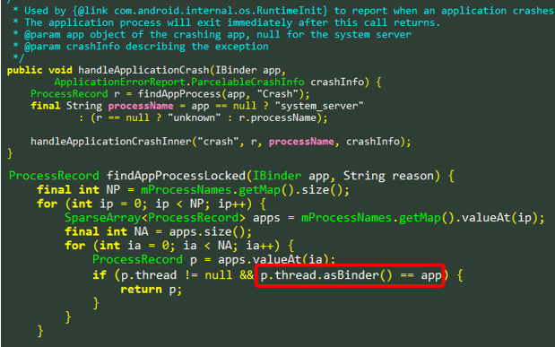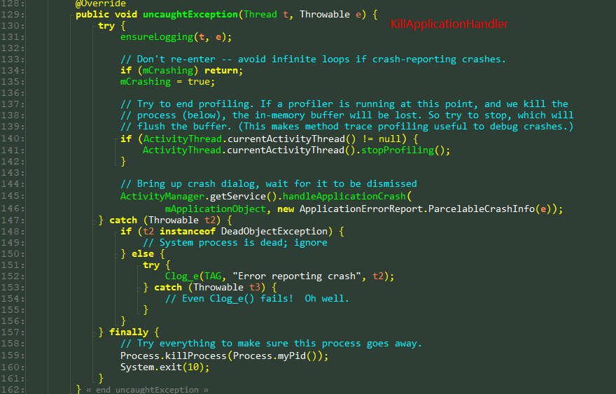 需要注意的是,preHandler的设置并非对外公开api,应用无法使用。但是Thread的setDefaultUncaughtExceptionHandler是公开的api,应用进程可以通过重设它来实现自己捕获uncaughtException。这种情况下,系统日志中虽然打印了FATAL EXCEPTION,但是应用并没有死掉。应用可以通过这种方式自己捕获异常的堆栈,但是通常情况下,捕捉完信息后,建议还是杀掉或者重启进程,这种如果处理不好的话,容易出现应用假死(无法运行也不会自动退出) 的情况。