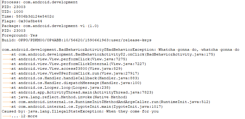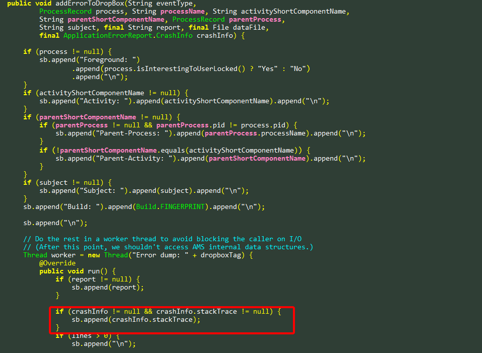 写入的内容包括进程名、pid、uid、时间、flag、包名、前后台信息、fingerprint版本信息、crashInfo堆栈信息等,厂商定制可能会再加入一些其他的打印。