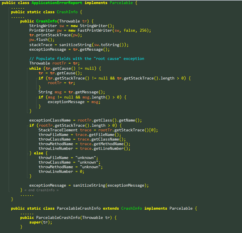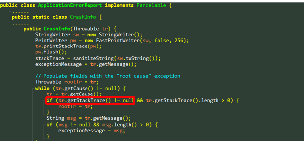 等需要打印的时候,再通过jni方法来获取。前面提到的AMS调用handleApplicationCrash这里getStackTrace获取的就是throwable初始化时记录下来的函数运行堆栈。