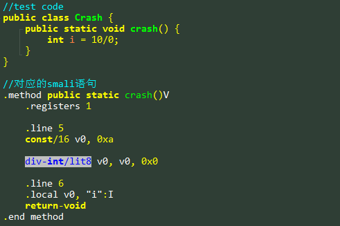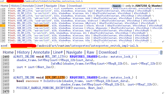 经过编译,这个触发操作最后会转化为一条div-int/lint8指令,当art虚拟机需要执行这条语句时,会去先解释这条语句,通过字符串匹配的方式找到对应的指令代码,这条语句对应的是DIV_INT_LIT8.