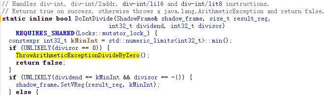 DIV_INT_LIT8会继续调用DoIntDivide方法。DoIntDivide方法定义如下,这里我们可以看到,当除数divisor为0的时候,虚拟机会通过hrowArithmeticExceptionDivideByZero方法抛出除零异常。