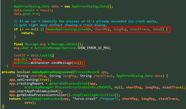 ② SHOW_ERROR_UI_MSG。主要用来处理crash之后的弹框提醒,阻塞并等待用户选择是否退出,用户不做选择超过5min或者手机休眠的话,会自动退出。