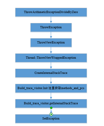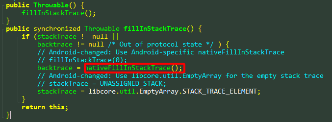 这个jni方法最终会调用到art虚拟机的Thread:: CreateInternalStackTrace方法中。这就和刚才未检查异常里面获取stackTrace用到了同样的方法。这里会把exception(throwable)的堆栈环境记录下来。