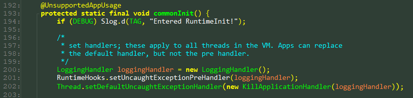 我们知道,Android系统中,System_server进程和各种应用进程都是从zygote进程孵化而来,zygoteInit的时候会调用Runntime.commonInit(),这里就会设置进程默认的uncaughtExceptionHandler,代码实现如下: