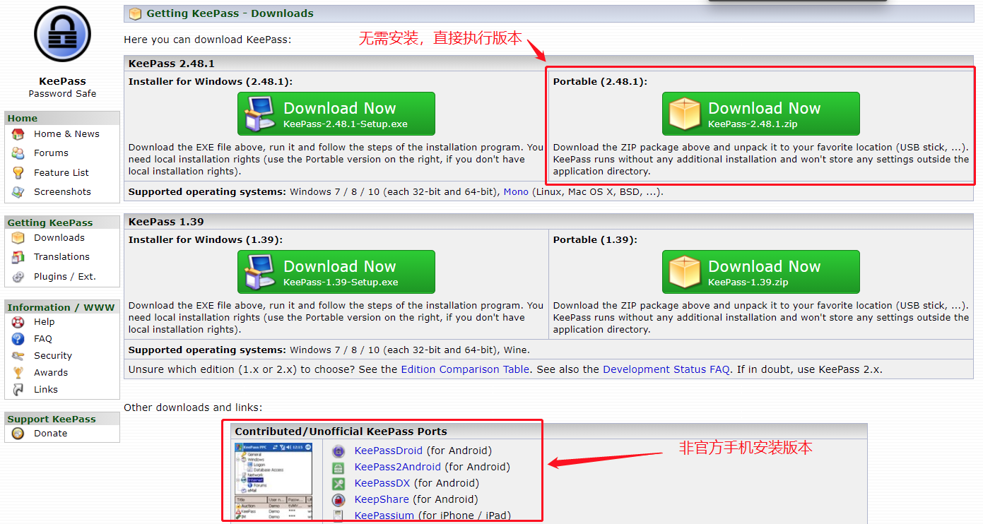 安卓:KeePassDroid (适用于Android)、 KeePass2Android (适用于Android)、 KeePassDX (适用于Android)
