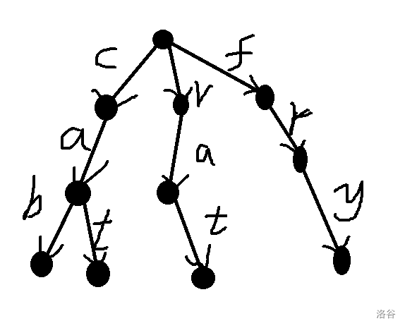 以记录字符串 \(cat,rat,cab,fry\) 为例。下图是普通的 \(Trie\) 树储存方法。