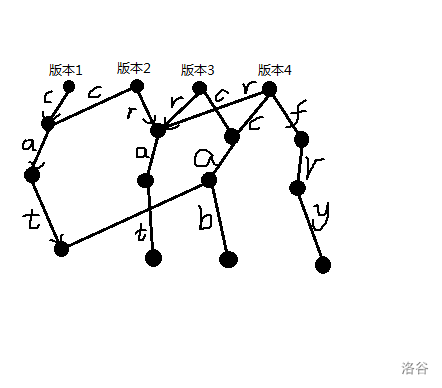 最上面的点就是每个版本的根节点。从每个版本的根节点出发,就可以得到该版本的 Trie 树。如下图所示,表示的是最后一个版本的 Trie
