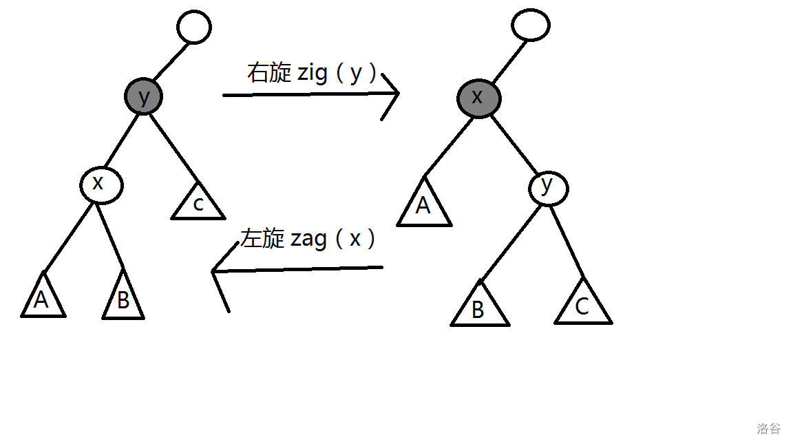 以右旋为例。在初始情况下,\(x\) 是 \(y\) 的左儿子,\(A\) 和 \(B\) 分别是 \(x\) 的左右儿子,\(C\) 是 \(y\) 的右儿子。