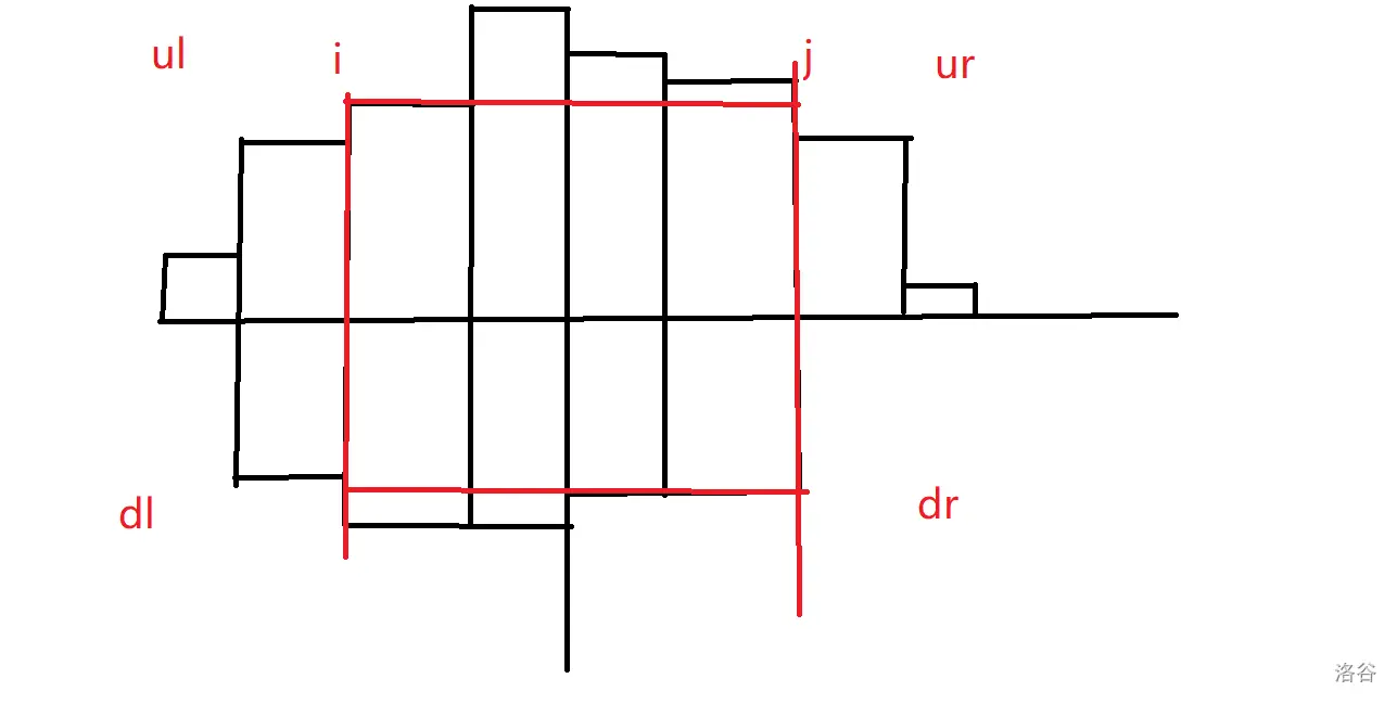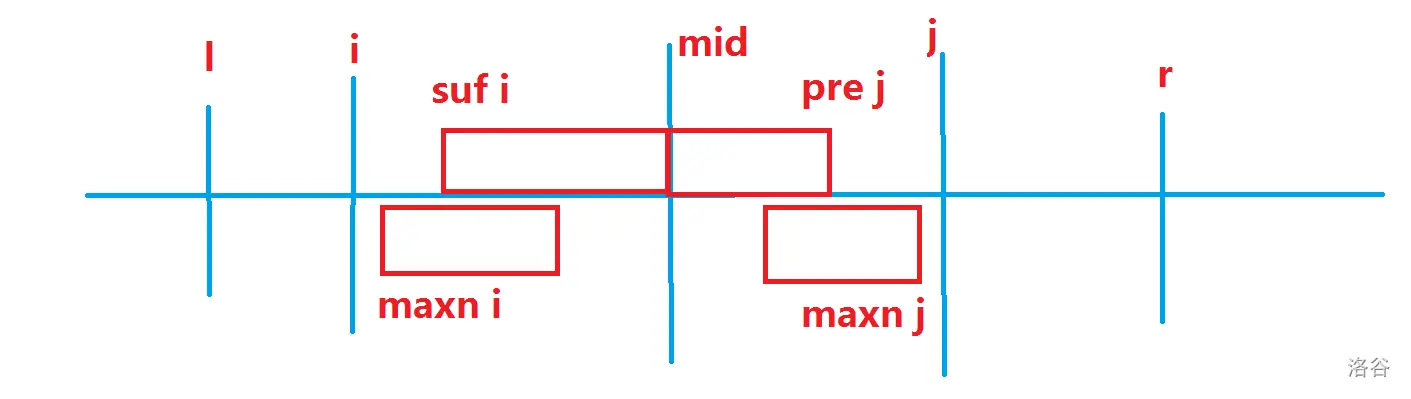 考虑对 \(mid\) 前面求最大后缀和 \(suf\) ,对 \(mid\) 后面求最大前缀和 \(pre\),这两个数组显然具有单调性。同时分别求出 \([i,mid](l\leq i \leq mid)\) 内的最大字段和 \(maxn_i\),以及\([mid+1,j](mid+1 \leq j \leq r)\) 内的最大字段和 \(maxn_j\)。