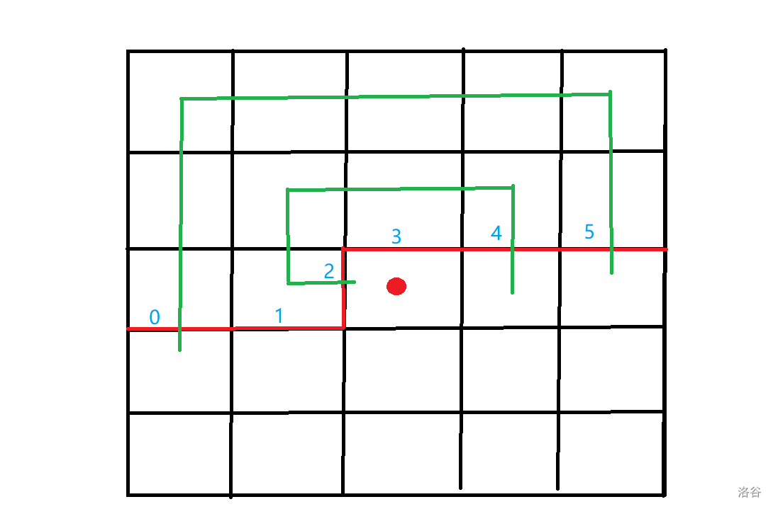可以发现,当枚举该格子的状态时,需要用到边界线的状态。即记录是否有边要出来。同时还要记录这些出来的边(绿色边)的联通性,即哪些边是连在一起的,因为最终的状态是一个联通块。如上图中,\(0,2,4,5\) 红边是有绿边要出来的,而 \(2\) 和 \(4\),\(0\) 和 \(5\) 分别属于一个连通块。