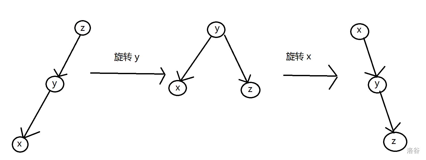 if((tr[z].son[0]==y)^(tr[y].son[0]==x)) rotate(y);//当异或值为true时,代表x,y,z不在一条链上,