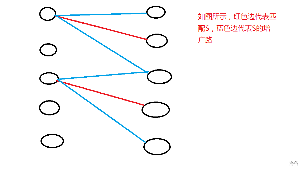 对于任意一组匹配 \(S\) (\(S\) 是一个边集),属于 \(S\) 的边被称为“匹配边”,不属于 \(S\) 的边被称为“非匹配边”。匹配边的端点被称为“匹配点”,其他节点被称为“非匹配点”。如果在二分图中存在一条连接两个非匹配点的路径 \(path\),使得非匹配边与匹配边在 \(path\) 上交替出现,那么称 \(path\) 是匹配 \(S\) 的增广路,也称交错路。如下图所示: