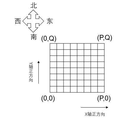 西南角的坐标为 \((0,0)\),东北角的坐标为 \((P,Q)\)。