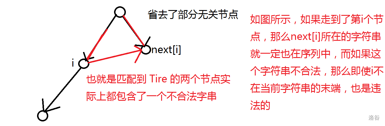 首先将所有的不合法字串存入 Trie 中,并对每一个字串末尾的编号打上标记,表示不能匹配到这个位置。但是需要注意的是,如果当前节点的 \(next\) 数组指向的节点被打上标记,那么当前节点也要被打上标记。如下图所示:
