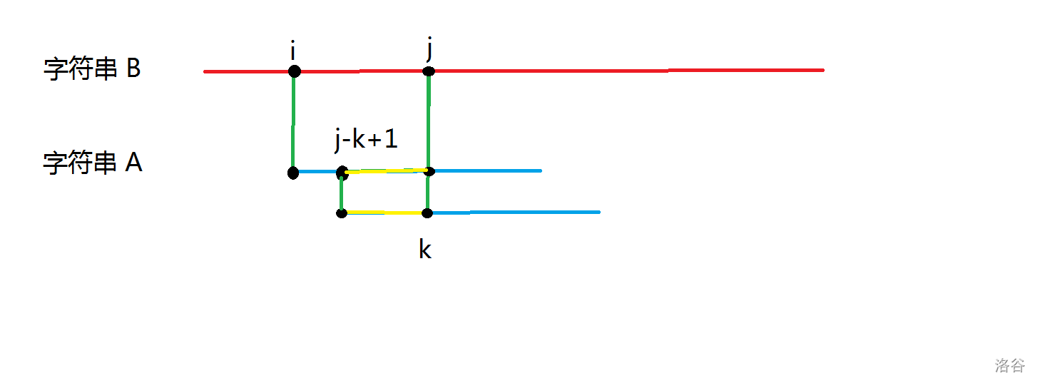 如图所示,如果字符串 \(A\) 的第 \(j-k+1\) 位到 第 \(j\) 位和第 \(1\) 位到第 \(k\) 位是匹配的,那么自然字符串 \(A\) 的第 \(1\) 位到第 \(k\) 位和字符串 \(B\) 的第 \(j-k+1\) 位到第 \(j\) 位也是匹配的,那么就省去了重头开始匹配的时间。