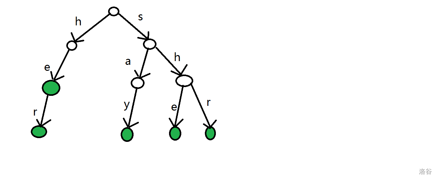 以单词she,he,say,shr,her和文章yasherhs为例。先对单词构造一棵 Trie,如下图所示。