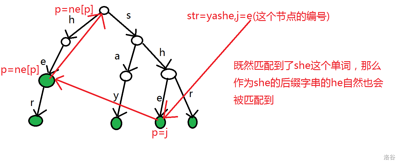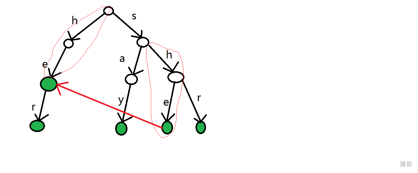 再对这些字符串求一个 \(next\) 数组,但是不同于普通的 KMP 算法(可以将 KMP 算法的字符串看成是在 Trie 上的一条链),这里的 \(next\) 数组存的是一个节点编号,也就是当前字符串匹配的最长前缀字串的最后一个字符的编号,同时这个前缀不要求和字符串在同一条链上。这样说有点难以理解,下图以 she 为例: