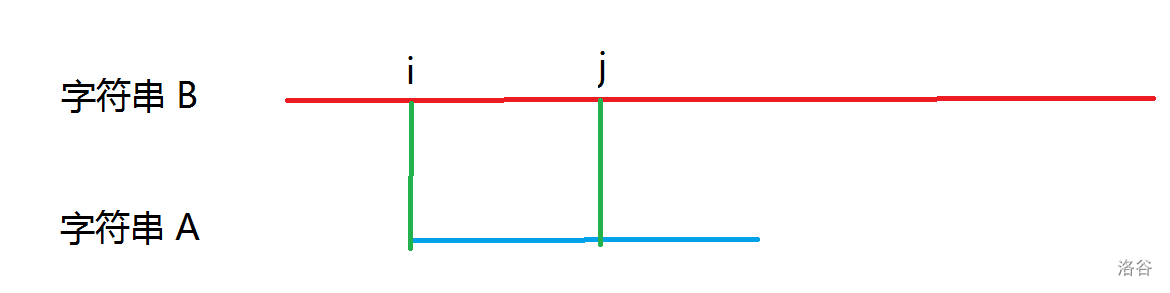 字符串 A 和 字符串 B 在 第 \(i\) 位到第 \(j\) 位完全一样,但是在第 \(j+1\) 位就不一样了。此时对于朴素的做法,就会从第 \(i+1\) 位开始重新匹配。但是显然这样是没必要的。