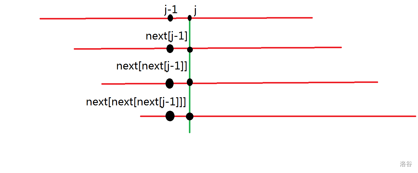 定义 \(next[j]\) 表示字符串 \(A[j]\) 的前缀和以 \(i\) 结尾的非前缀字串匹配的最大长度。如下图所示: