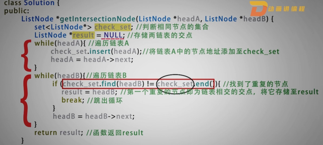 2.通过将其中一个链表的所有结点存放到STL中的集合中,set.insert()结点插入到其中,