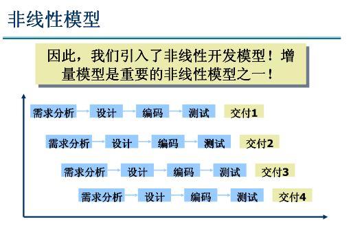 在开发构成中,需求的变化是不可避免的。增量模型的灵活性可以使其适应这种变化的能力大大优于线性模型,但也很容易退化为边做边改模型,从而是软件过程控制失去整体性;
