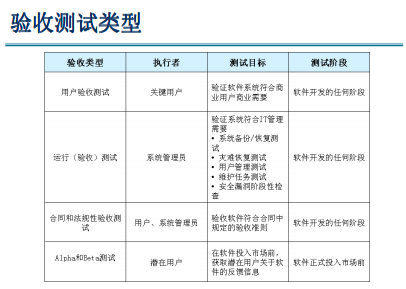 验收测试:从用户的角度检查系统是否满足合同中定义的需求或者用户需求;