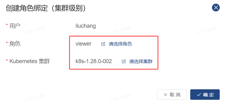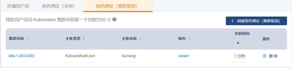 创建一个用户组,在用户组中实现角色绑定(集群级别),将 liuchang 用户加入到该用户组即可。