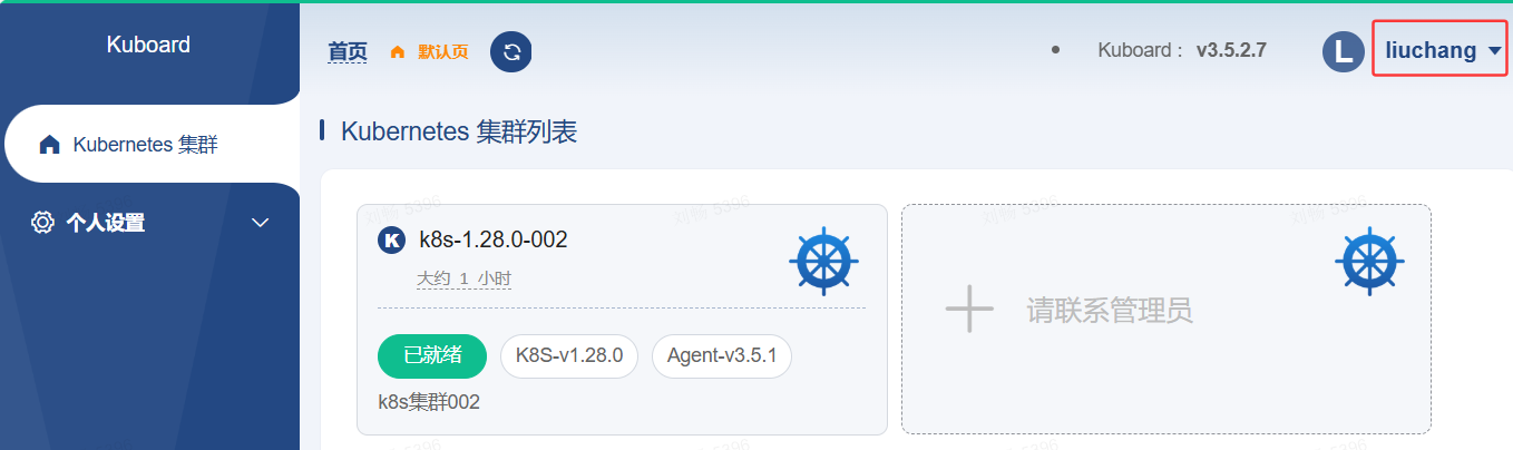 使用 liuchang 账号登录 kuboard 成功后发现 Kubernetes 集群列表下只有k8s-1.28.0-002集群。