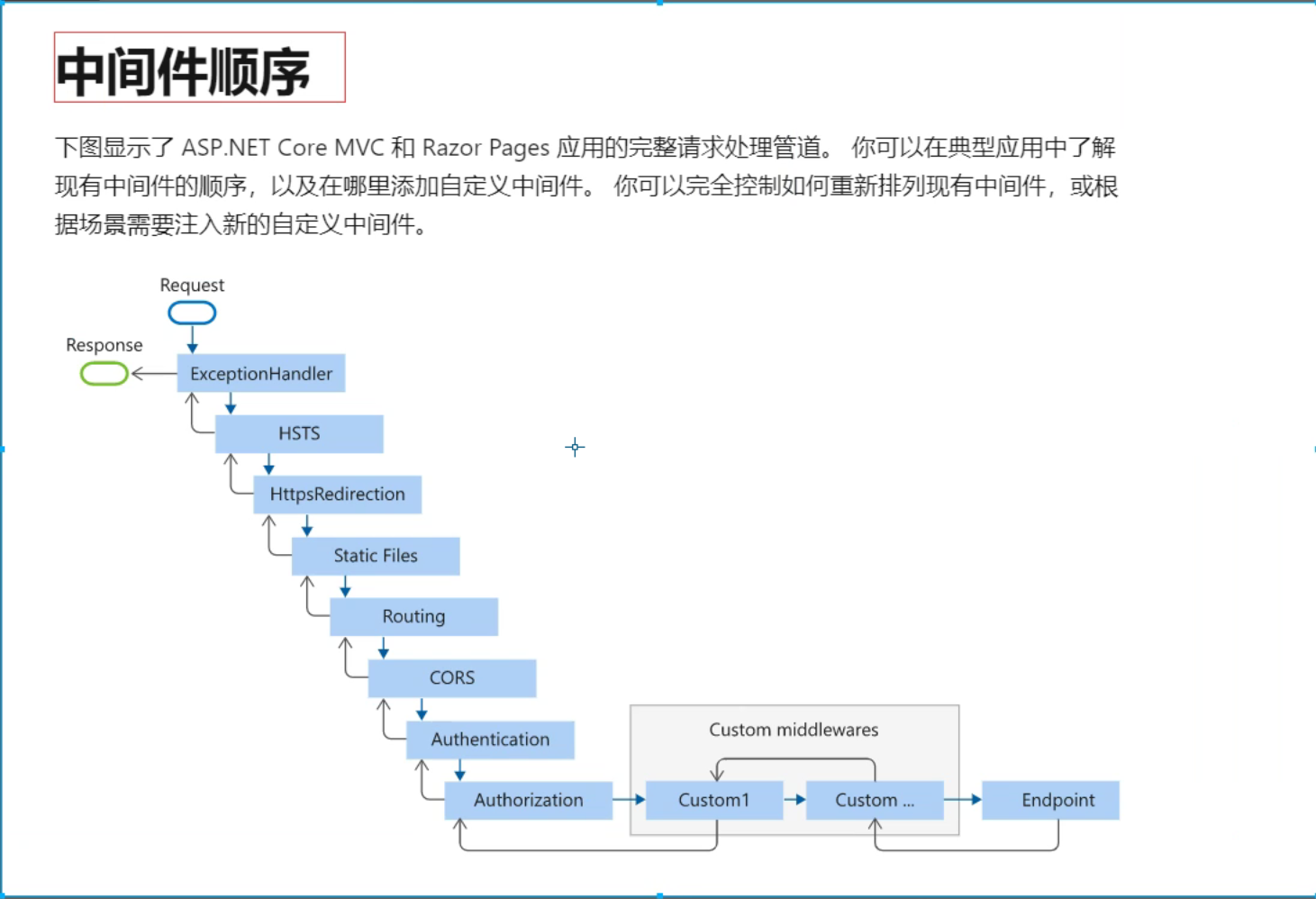 今天初步了解了下.net core中间件的知识,当用户的一个Request访问到API时,按照如下的顺序执行中间件