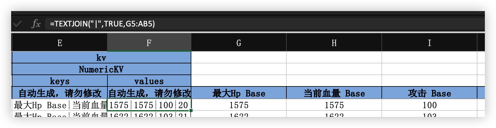 values 使用同一行的值,而 key 固定使用蓝色属性槽中的定义,这样策划只需要在辅助列中去做属性投放,而程序真正关心的只有 kv 这个对象