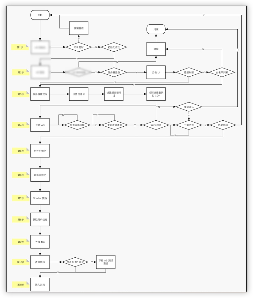 下图已经做了脱敏处理,这个是我们游戏客户端整体登录的流程走向,总体分成 11 步,每一个步骤都有自己专门的处理过程
