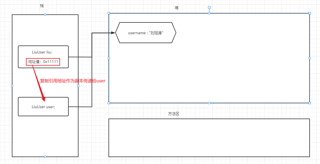 这个例子中,将'实参liu'作为参数传入change1方法中,方法中对'对象地址'进行变动(user = new LiuUser();)
