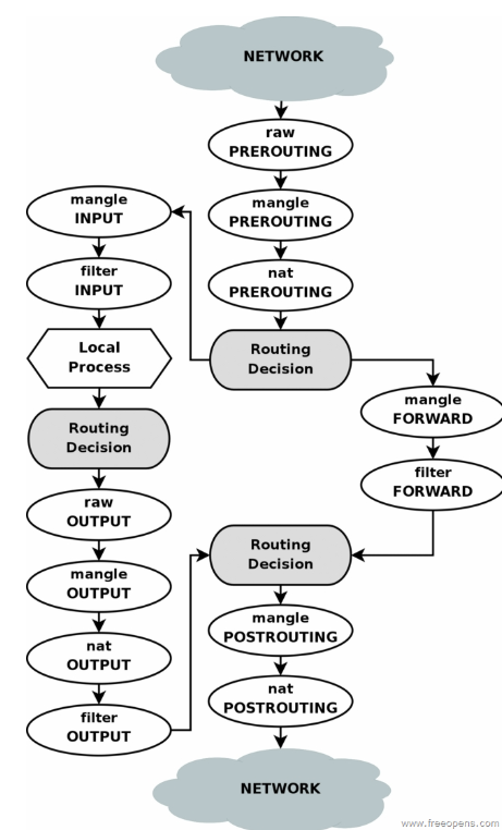 一个数据包到达时,是怎么依次穿过各个链和表的(图)。