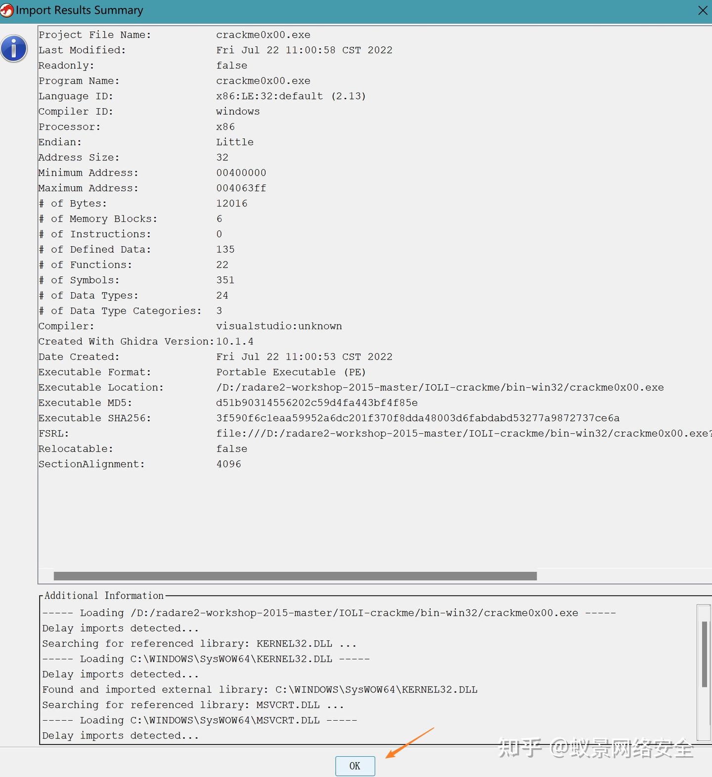 选择导入后,Ghidra会提示文件的基本信息,然后点"OK"